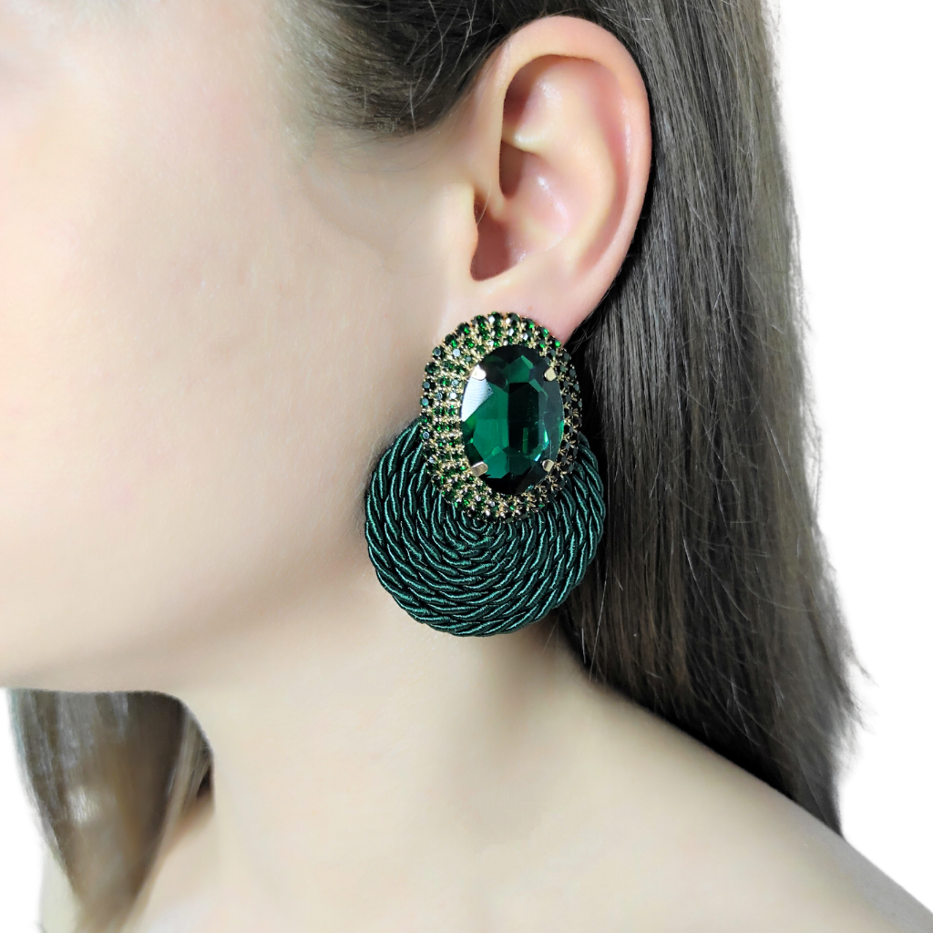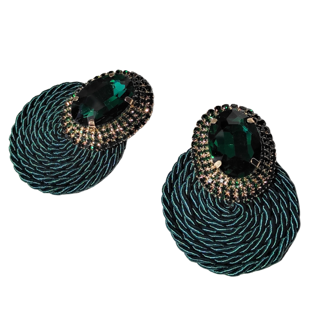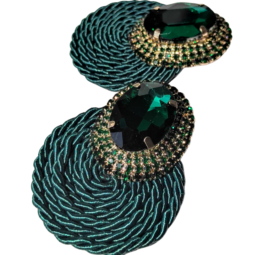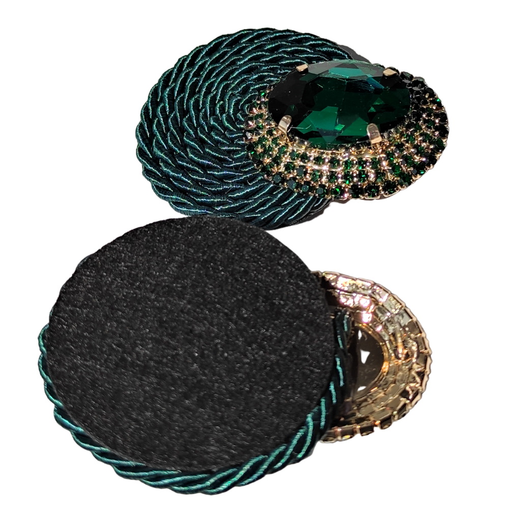 Cerceii ECLAT sunt realizați manual din material textil, la care sunt aplicate strasuri de dimensiuni mari, culoare verde-regal.